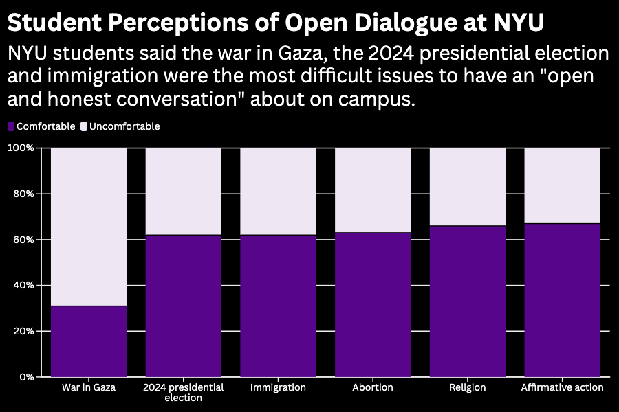 FIRE surveyed over 68,000 students across the country to support its rankings. Students were asked about how often their peers self-censor, how they felt administrators handle expression-related issues and the overall dynamic with tense conversations on campus. Nearly 70% of NYU students said they were uncomfortable expressing opinions about “the Israeli/Palestinian conflict,” and over 30% shared the same sentiment for topics such as “Religion,” “the 2024 presidential election” and “immigration.”