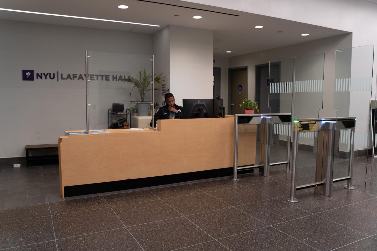 The 80 Lafayette St. doorway has been the dorm’s main entrance since 1999, and had a small stairway leading up to the security booth without an accessibility ramp. The old lobby experienced bottlenecks and overflow during high-traffic times, such as when large numbers of non-NYU guests check in. The original entrance continues to serve as a pick-up spot for students boarding buses to NYU’s Washington Square and Brooklyn campuses.